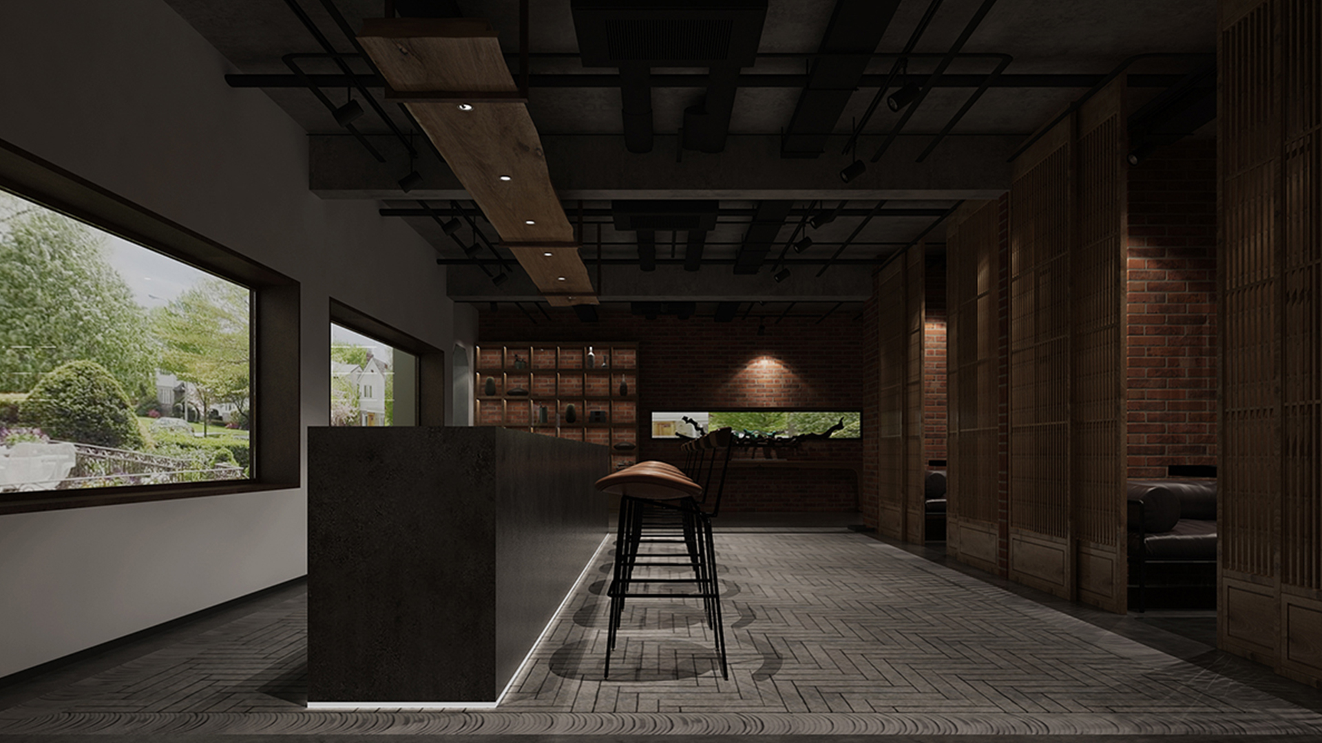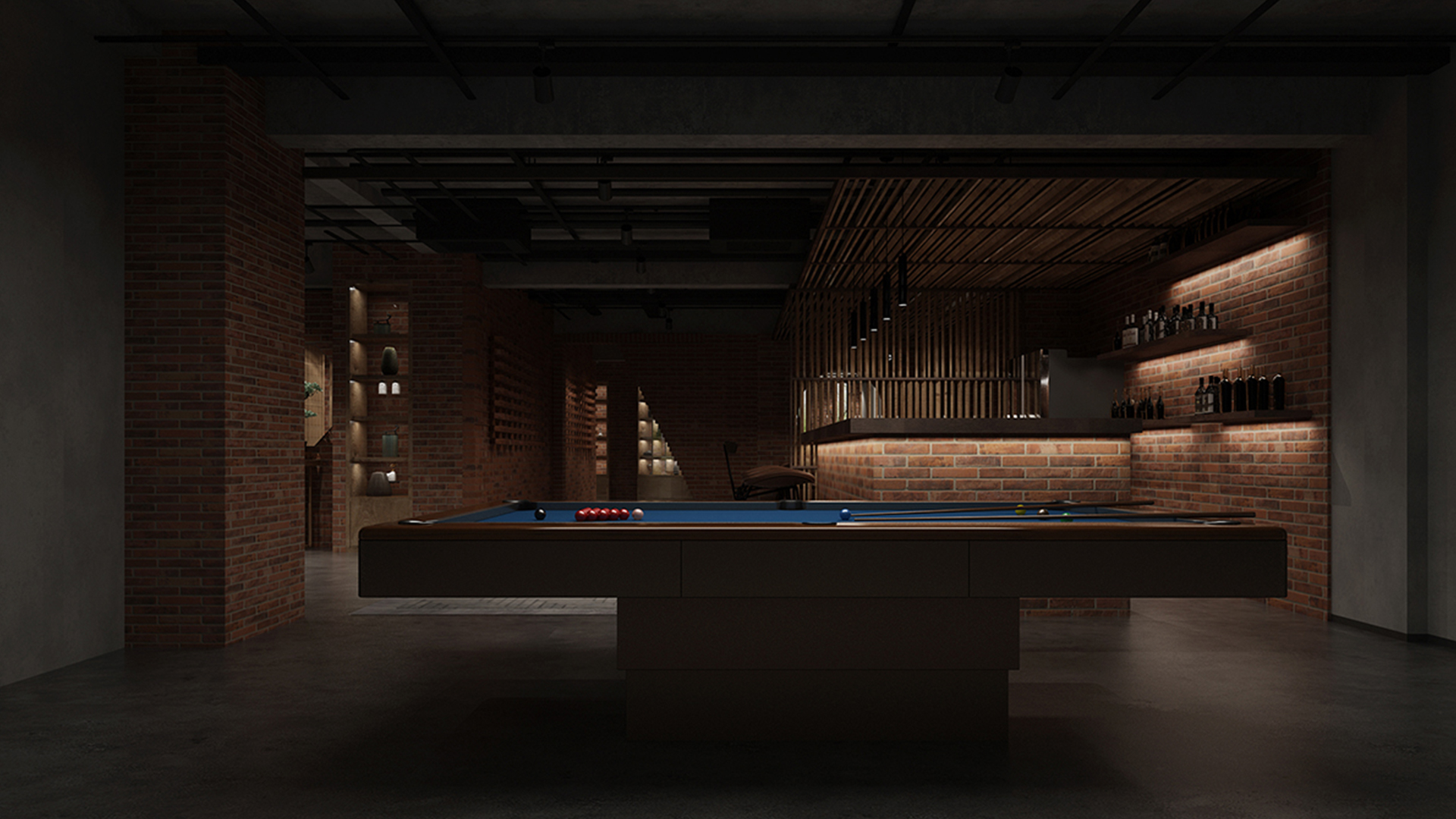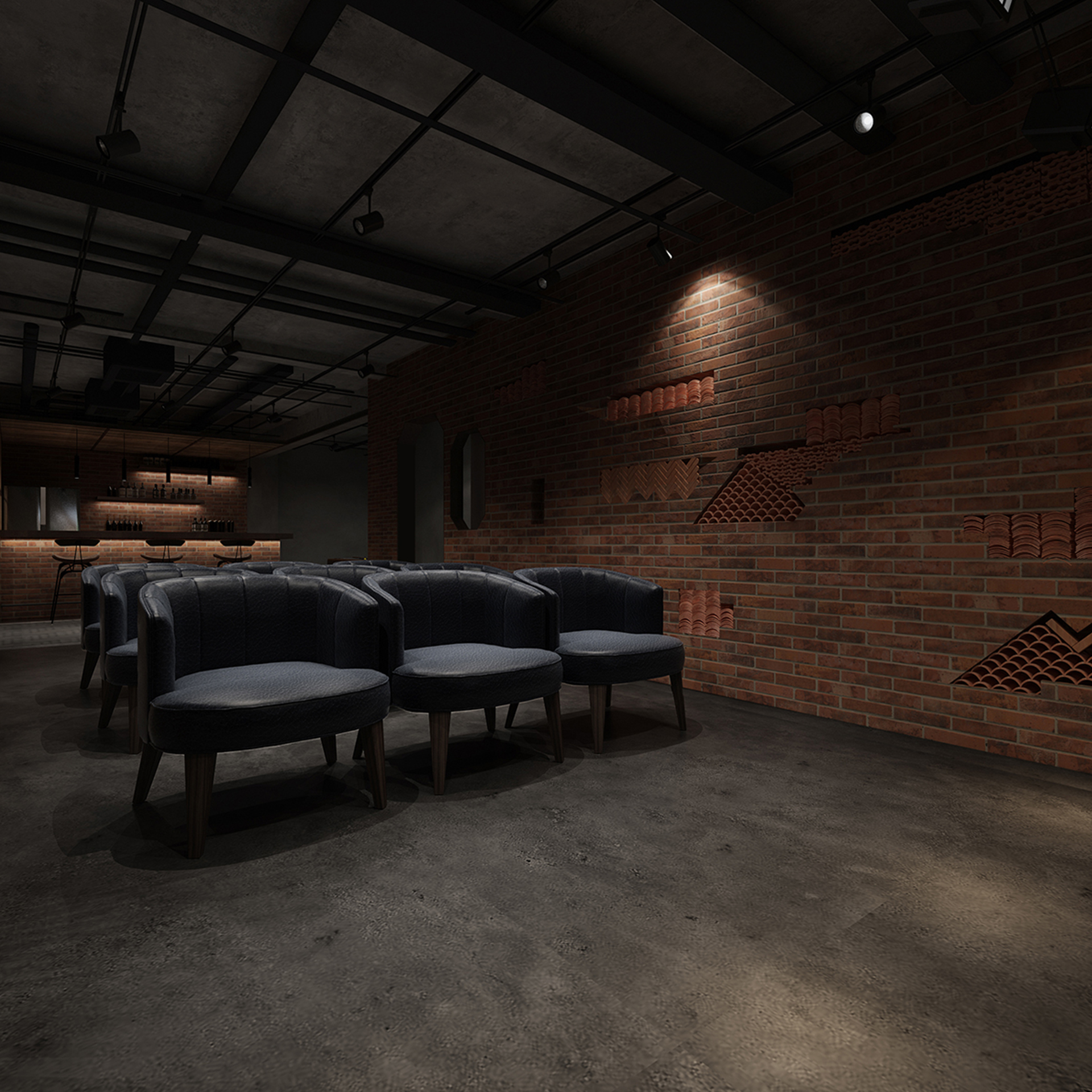 酒吧寬闊的通道讓吧臺、酒墻、沙發(fā)區(qū)分散開來,讓在不同區(qū)域活動的人在碩大的空間中找到自己的歸屬。光在整個空間中扮演著各種角色,有些讓人沉靜,有些讓人興奮。石墻、鵝卵石,最純粹的建筑元素在精心的排布和設(shè)計中發(fā)揮了其美的特點。墻面構(gòu)筑元素采用了泡沫紅陶瓷用來模擬紅磚材料,防水防火?;璋档沫h(huán)境下,人們才真正可以與世隔絕,享受自由。